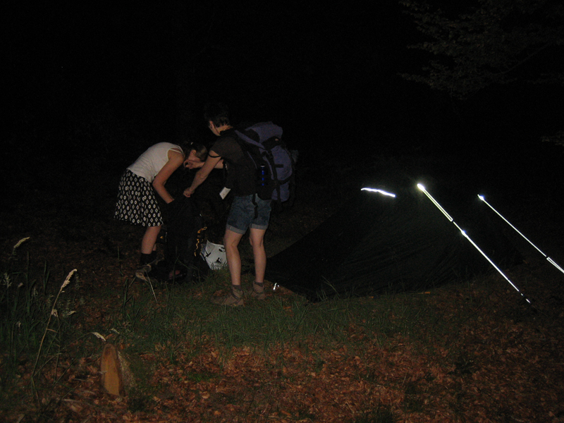 Na het avondmaal stappen we met een lichte rugzak richting station. De timing zit goed. Na nog geen 5 minuten is de trein daar. Het wordt een hartelijk weerzien. Vanaf nu stappen we met 3. Hoe dichter we bij onze tent komen hoe donkerder het wordt. Het laatste half uur zien we geen hand voor onze ogen meer. Gelukkig zijn we al samen.