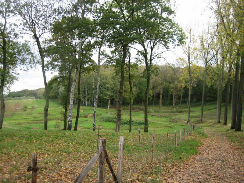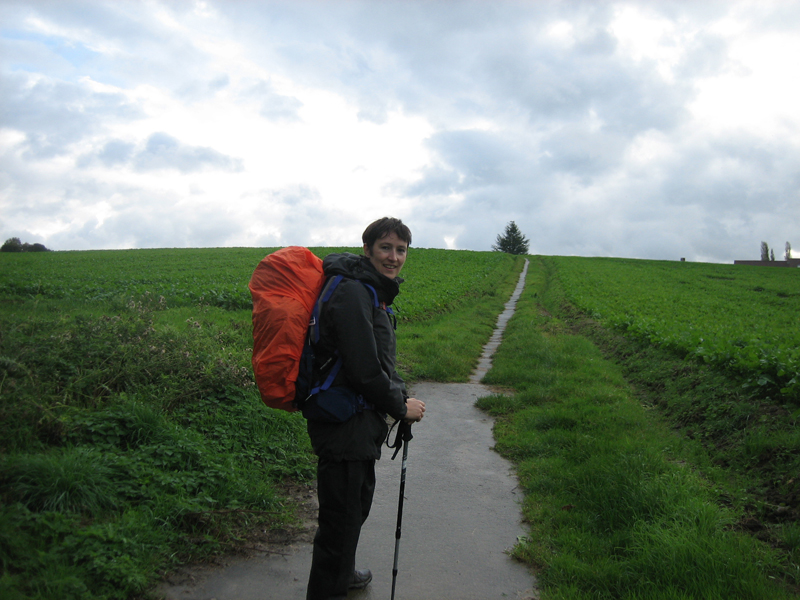 We stappen het eerste uur in de regen door het Berchembos. Af en toe is het erg glibberig op de hellingen. Aan de andere kant van het bos is het slechte weer gelukkig over.