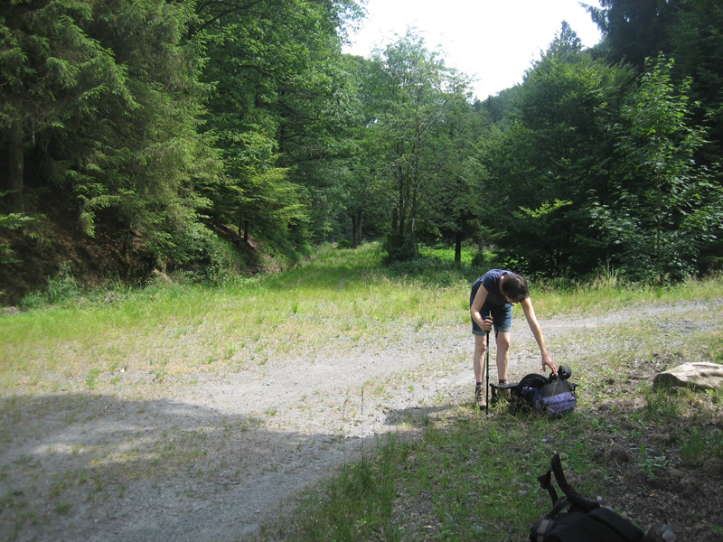 We trekken richting zuid over een oude brug waar enkel nog met de fiets of te voet mag over gegaan worden. Daarna het bos in. Het klimmen kan beginnen wat dik tegen valt. Veel te warm. Ik twijfel of dit wel nog menselijk is. Boven gekomen wandelen we een stukje in de zon. De temperatuur blijft maar stijgen.