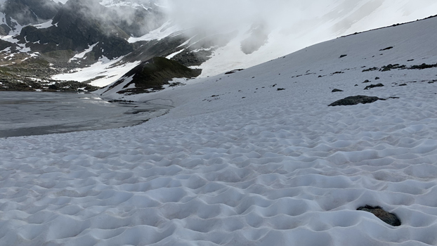 Een gevaarlijke afdaling volgt. Bijna beneden probeer ik zo lang mogelijk op de sneeuw te blijven en kom uit aan het bovenste meer.