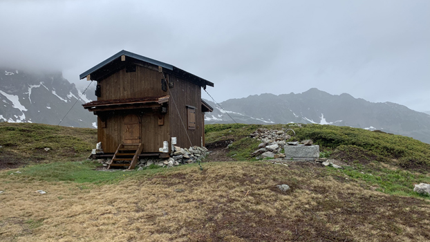 Hier staan een paar 'refuges' die ik eens van dichtbij wil bekijken. Allemaal potdicht maar 's middags kom ik aan Chalet de Jovet waar een afdak is. Perfect om even te schuilen en wat te eten. De zon komt er even door en ik slaag er zelfs in om bijna alles te drogen.